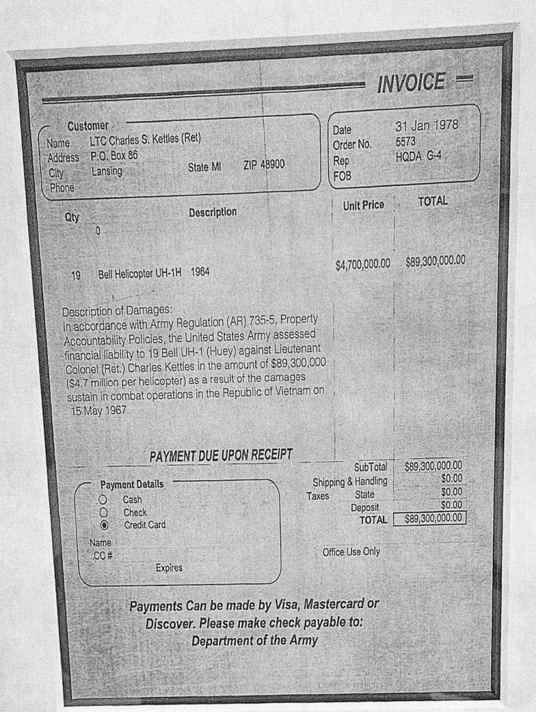 War is serious and brutal. However, you can find humor in the circumstances. In January 1978, the Department of the Army sent Kettles an invoice for 19 Hueys that were shot up while he was flying them in Vietnam. The bill was for $89,300,000. He forwarded a letter explaining what happened to those helicopters. One was a total loss, but "the other 18 helicopters required various responsibilities for leading each of the five flights in and out of the LZ and the single aircraft back in to pick up the last eight infantry soldiers. IN view of the above information, some offset ot the $89,300,000 would seem appropriate." This joking continued, and in November 2016, the Secretary of the Army waived the financial liability for damaging those 19 Hueys if Kettles acted "as an ambassador for the Army to help tell our story to the men and women both in and out of uniform."
