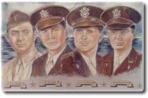 Between the early days of May to late July, the four had entered military service from different areas of the country. Reverend Fox enlisted in the Army from Vermont the same day his 18-year old son Wyatt enlisted in the Marine Corps. During World War I, though only 17 years old, Fox had convinced the Army he was actually 18 and enlisted as a medical corps assistant. His courage on the battlefield earned him the Silver Star, the Croix de Guerre, and the Purple Heart. When World War II broke out he said, “I’ve got to go. I know from experience what our boys are about to face. They need me.” This time, however, he didn’t enlist to heal the wounds of the body. As a minister, he was joining the Chaplains Corps to heal the wounds of the soul.