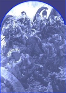 In the chaos around them, lifeboats floated away before men could board them. Others capsized as panic continued to shadow reason and soldiers loaded the small craft beyond the limit. The strength, calm, and organization of the Chaplains had been so critical in the dark hull. Now, on deck, they found that their mission had not been fully accomplished. They organized the effort, directed men to safety, and left them with parting words of encouragement. In little more than twenty minutes, the Dorchester was almost gone. Icy waves broke over the railing, tossing men into the sea, many of them without life jackets. In the last moments of the transport’s existence, the Chaplains were too occupied opening lockers to pass out life jackets to note the threat to their own lives.